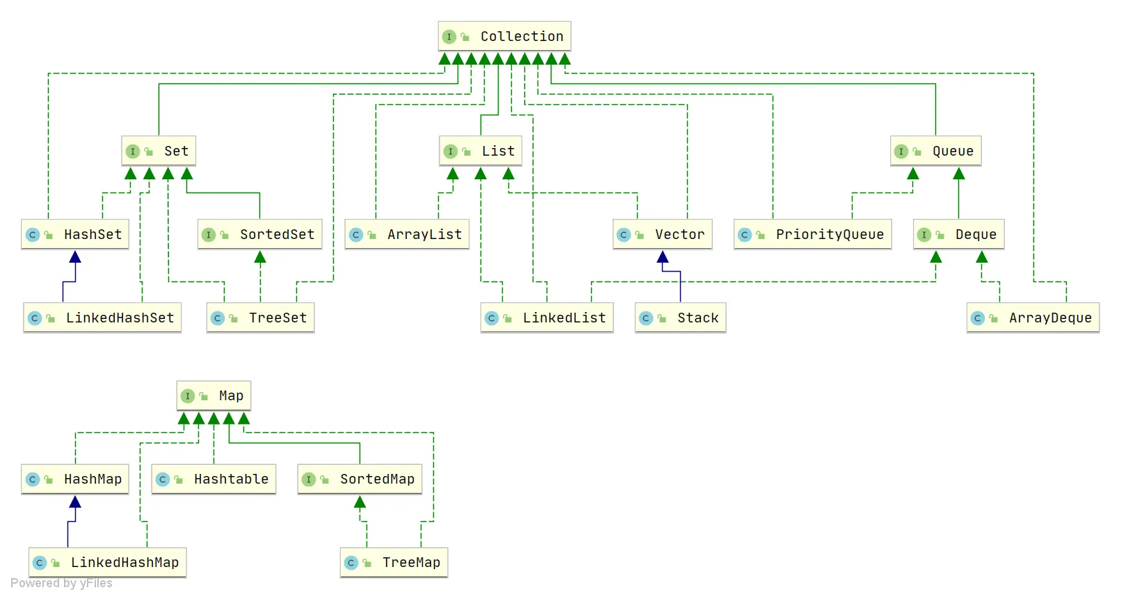 由两大接口派生而来:一个是 Collection 接口,主要用于存放单一元素;另一个是 Map 接口,主要用于存放键值对。对于 Collection 接口,下面又有三个主要的子接口:List、Set 、 Queue。